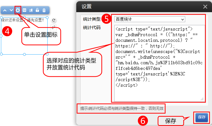 2.设置选择百度统计谷歌统计等,并输入相应代码。(统计类型和统计代码必须一致否则无效)